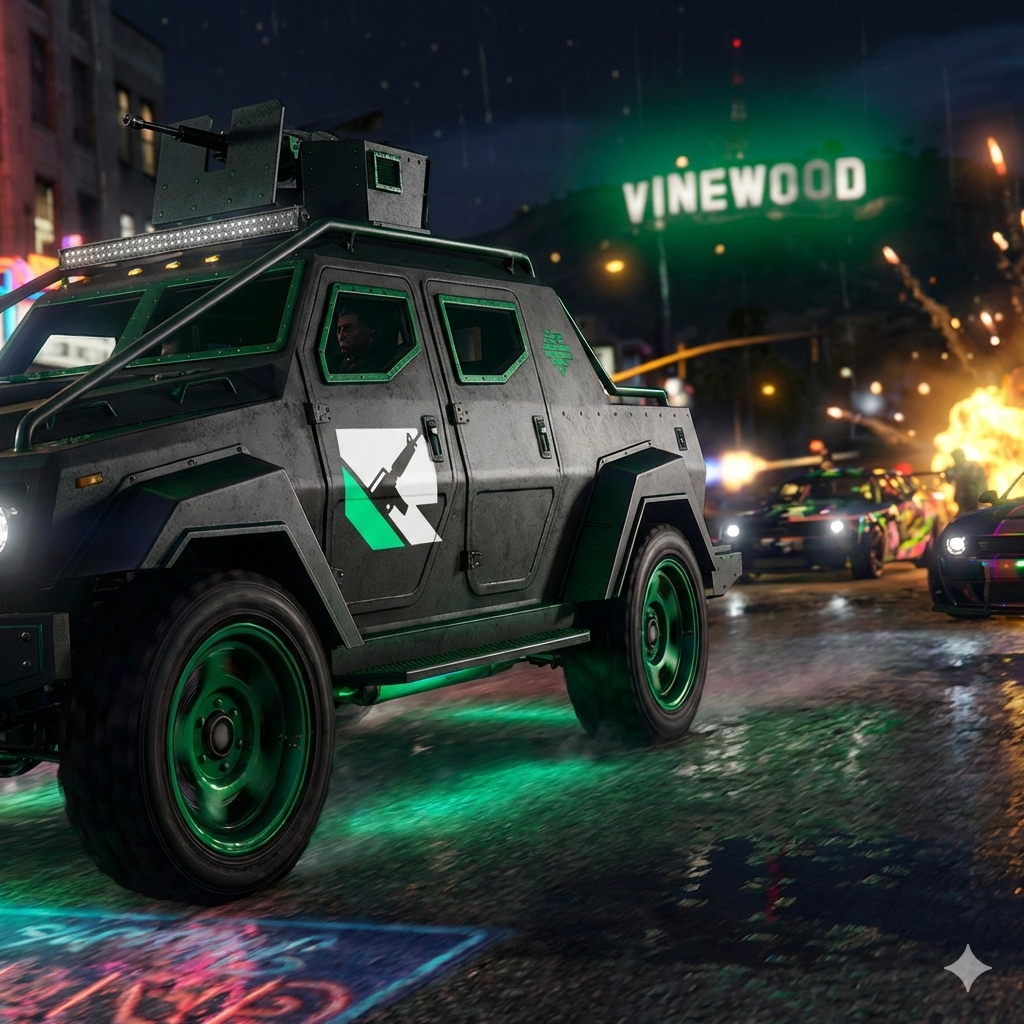 Veículos reforçados com blindagem nível 4 e pneus à prova de balas. Domine as ruas com segurança.